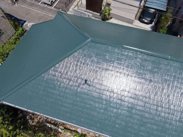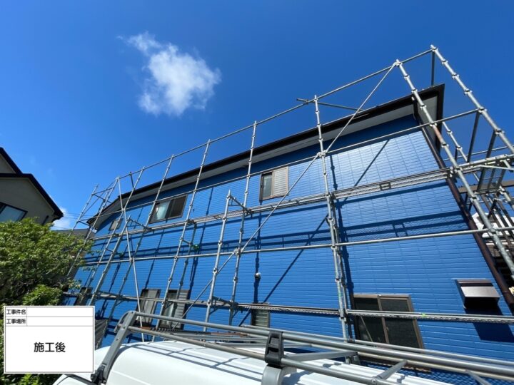 使用材料 | 屋根:アステックペイント 無機ハイブリッドコートJY-IR(9116グリーンレイバー) 外壁:アステックペイント 超低汚染リファイン1000MF-IR(8216ブルーアッシュ) 付帯部:フッソUVコート溶剤、マルチエース |