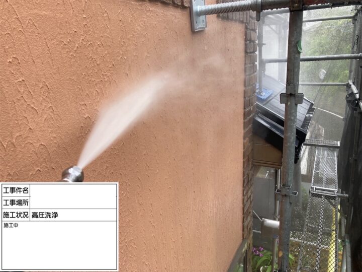高圧洗浄で外壁に付着した汚れを落としていきます
